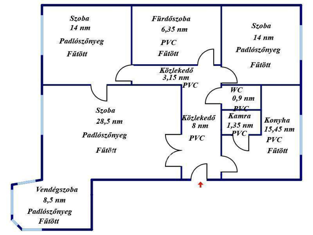Az ingatlan az utcafronti részen egy 28 nm-es nagy nappalival, abból nyíló 8 nm-es vendégszobával, egy 14 nm-es dolgozó szobával, a csendes belső udvarra néző 12 nm-es hálószobával, 15 nm-es konyhával, abból nyíló kamrával, külön-bejáratú fürdőszobával, WC-vel, közlekedő folyosóval rendelkezik, fűtéséről gázkazán gondoskodik, alumíniumból készült, radiátor hőleadók segítségével.