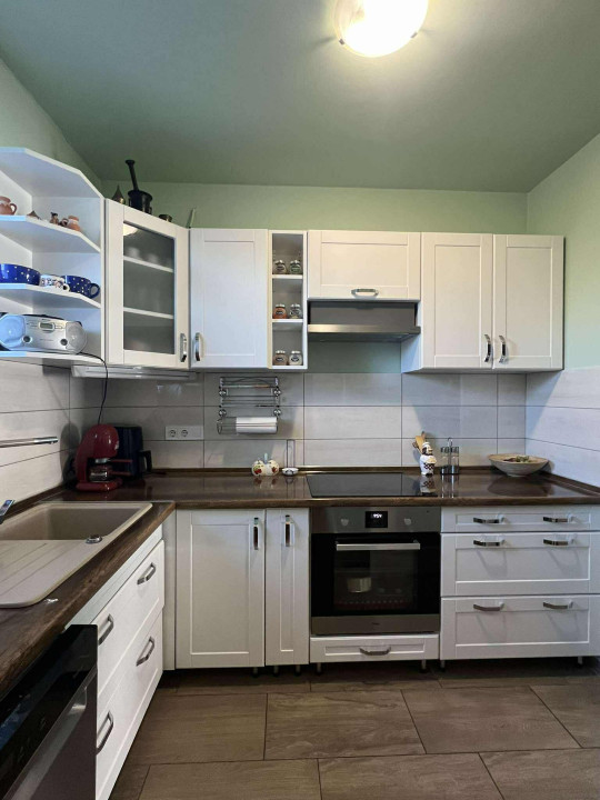 Konyhában gyönyörű, igényes, egyedileg gyártott, magas minőségű konyhabútor, háztartási gépekkel felszerelve.