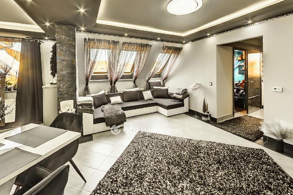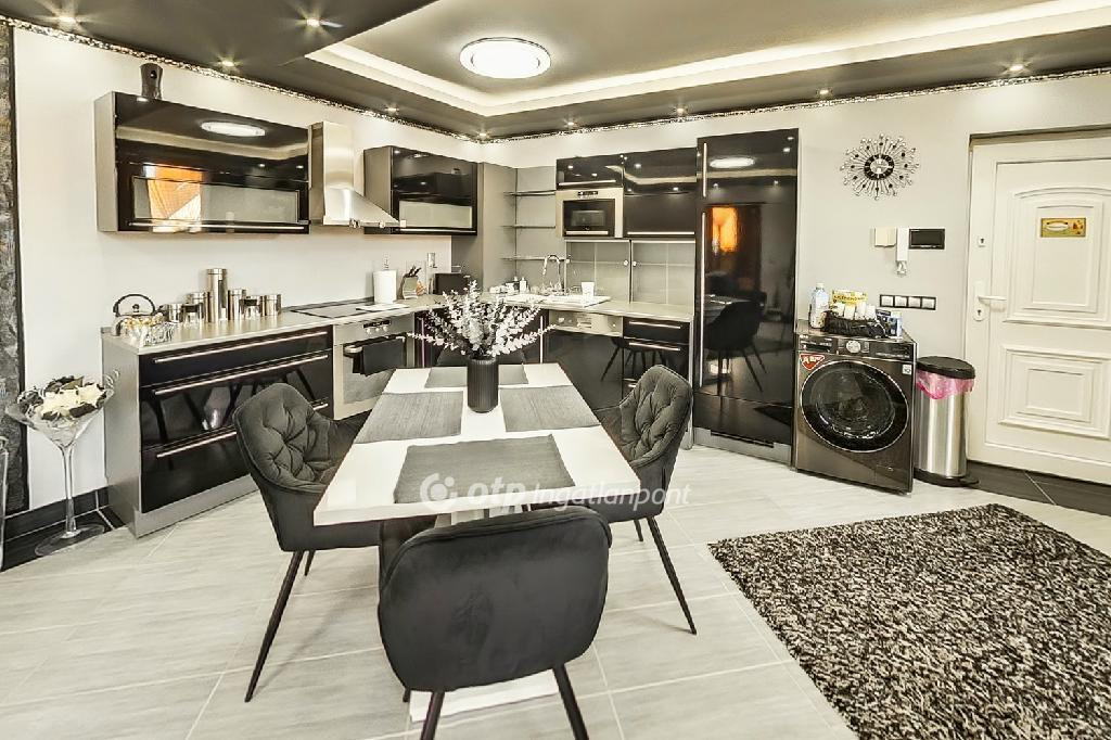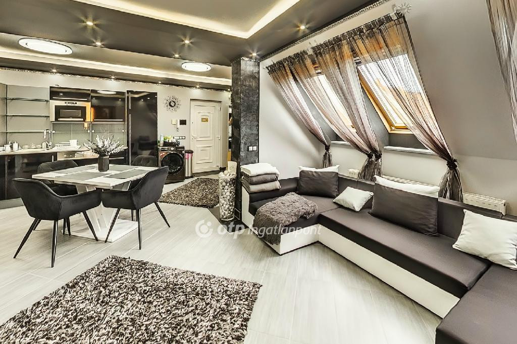 A tágas, egybenyitott konyha-étkező-nappali térben egyszerre érezheted magad luxuskörnyezetben és otthonos közegben. A magasfényű fekete, teljesen gépesített Whirlpool konyhabútor, az üvegpolcos design sarok és a finom részletek egységes eleganciát teremtenek. A szürke, fekete szegéllyel díszített járólapok, a Swarovski díszcsíkkal ékesített mennyezet, a Velux tetőtéri ablakok és a selyemtapétás álmennyezet mind arról árulkodnak, hogy a lakás minden pontját igényesség hatja át. A nappaliban az U alakú, fekete-fehér ülőgarnitúra hívogat, hogy lepihenj rajta, vagy vendégeidet fogadd kényelmes eleganciában.