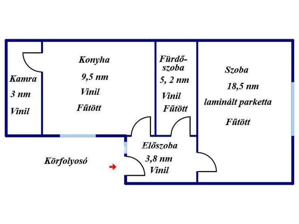 Az ingatlan egy 18,5 nm-es, a csendes belső udvarra néző nagy szobával, egy 9,5 nm-es konyhával, abból nyíló 3 nm-es kamrával, egy külön-bejáratú WC-s, 5 nm-es fürdőszobával, egy 4 nm-es előszobával és a lakószinten található 5 nm-es tárolóval rendelkezik, fűtéséről gázkonvektorok, meleg víz ellátásáról átfolyós gáz vízmelegítő kazán gondoskodik.