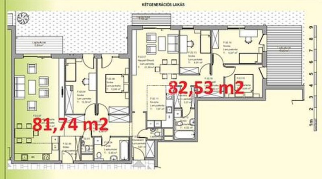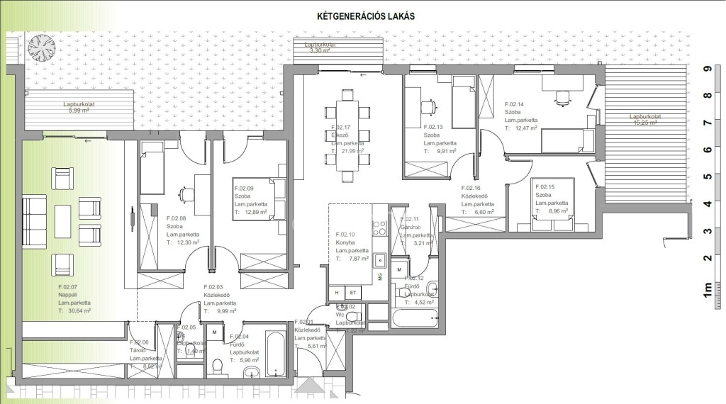 -F.02 lakás 164,3 m2; terasz: 32,85 m2; kert: 168,36 ár: 248.000.000,-Ft.