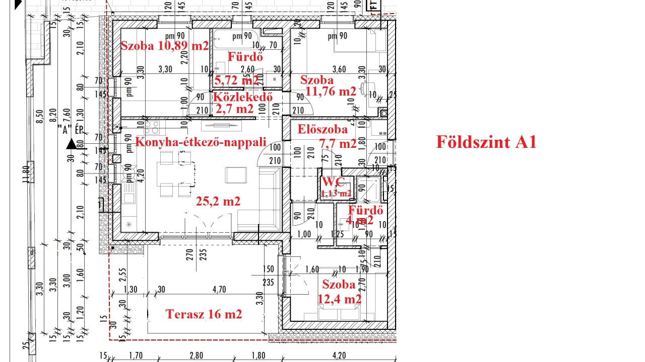 A1-es lakás. 3 szoba + nappali, 81,4 m2 (+ 16 m2 terasz), kertkapcsolat ~50 m2. 99,9 Millió Ft (+ kert 5 Millió + garázs 3 Millió vagy nyílt parkoló 2 Millió)