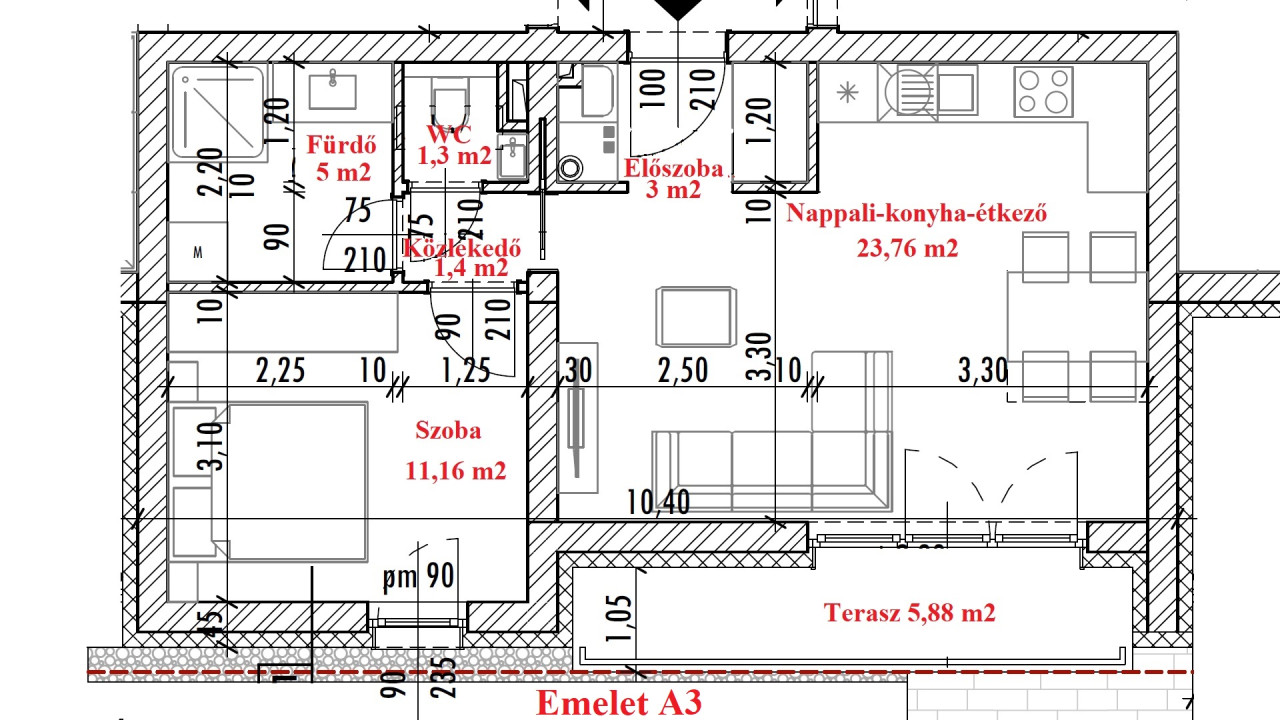 A3-as lakás. 2 szoba + nappali, 45,61 m2 (+ 5,88 m2 erkély + 5 m2 tároló). 64,9 Millió Ft (+ garázs 3 Millió vagy nyílt parkoló 2 Millió + Tároló 2 Millió)