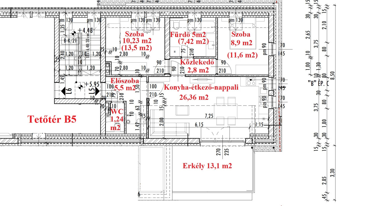 A TÁRSASHÁZI lakás 60 m2 hasznos lakóterületű (minimum 1,90-es belmagassággal számítva) a teljes alapterülete 69 m2 + 13,1 m2 erkély, 2 szoba (10,23 (13,5); 8,9 (11,6) m2) + nappali-konyha-étkező (26,4 m2), fürdőszoba, WC, előszoba, helyiségekből álló második emeleti (részben tetőtéri) lakás.