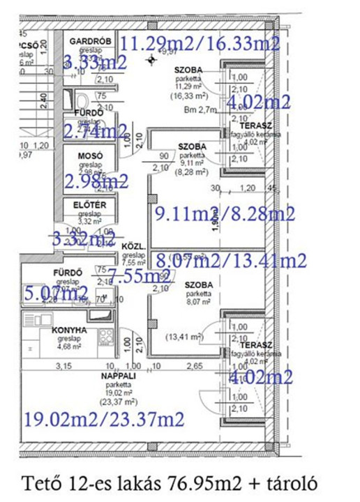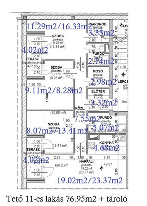11-es lakás / nappali + 3 szoba + 2 fürdő (76.95m2 + 2db terasz + tároló 5.13m2 + garázs 13.5m2), Ára: 79,99mft lakás 2 terasszal + 2mft tároló + 3mft garázs, összesen: 84,99mft. Előtér (3.32m2), közlekedő (7.55m2), 2 fürdőszoba + wc (5.07m2, 2.74m2), nappali (19.02m2) - konyha (4.68m2), mosókonyha (2.98m2), gardrób (3.33m2), 3 szoba (8.07m2, 8.28m2, 11.29m2), 2 terasz (4.02m2 / db.). /Kód: 5153/ Ez a lakás 2 kislakásra is bontható, mely esetben 2 db 36m2-es lakás alakulhat ki! (41,99mft + 46,99mft) - részletek miatt kérem hívjon.