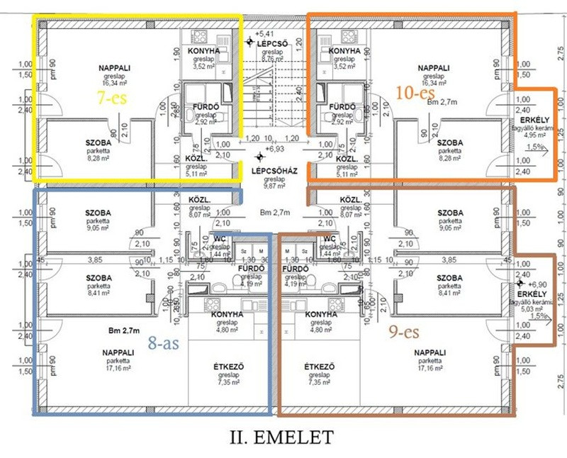 4-es lakás / nappali + 2 szoba (nettó 60.7m2 + tároló 5.13m2 + garázs 13.5m2), Ára: 76,99mft lakás + 2mft tároló + 3 mft garázs, összesen: 81,99mft. Közlekedő (8.07m2), wc (1.44m2), fürdőszoba + wc (4.19m2), nappali (17.16m2) - konyha (4.8m2) - étkező (7.35m2), 2 szoba (9.05m2, 8.41m2). /Kód: 5150/