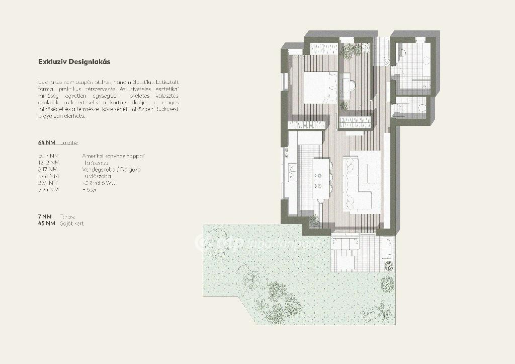 64 nm lakótér + 7 nm burkolt terasz + kb. 50 nm saját, gondozott kert + saját parkoló,
