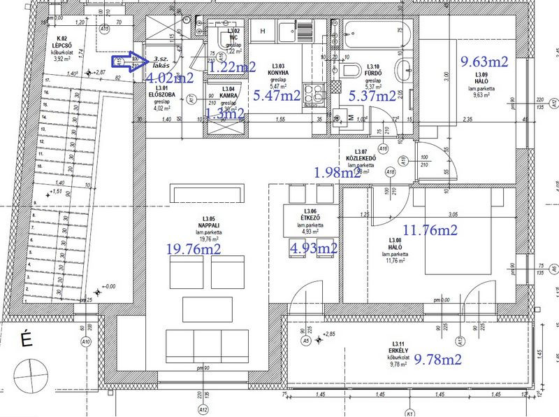 A lakás felosztása a következő (65.44m2 + 9.78m2 erkély): előszoba (4.02m2), wc (1.22m2), kamra (1.30m2), konyha (5.47m2) – étkező (4.93m2) – nappali (19.76m2), közlekedő (1.98m2), fürdőszoba + wc (5.37m2), szoba (11.76m2), szoba (9.63m2).