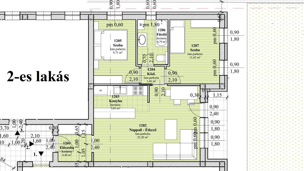 2-es lakás. 2 szoba + nappali, 60 m2 (+ 4,6 m2 terasz + 5 m2 tároló), kertkapcsolat. 78 Millió Ft (+ garázs 3 Millió + Tároló 2 Millió össz.: 83 Millió Ft)