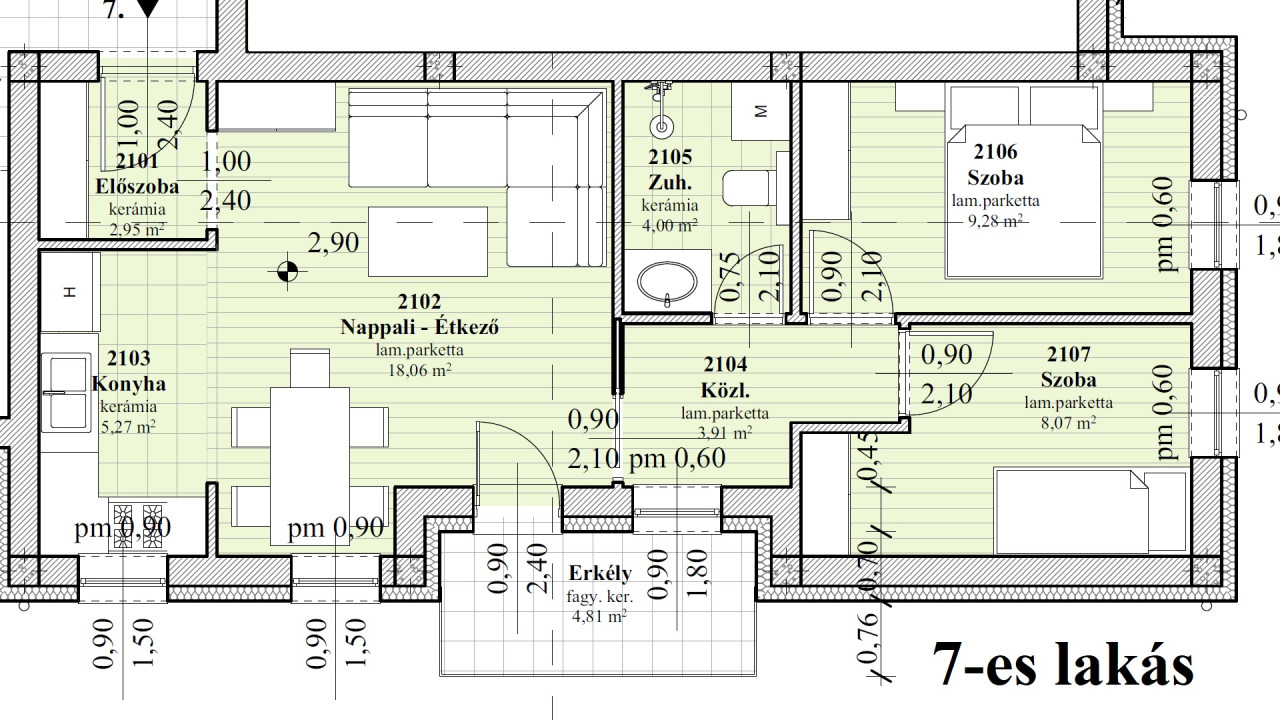 8-as lakás. 2 szoba + nappali, 60,19 m2 (+ 4,74 m2 erkély + 5 m2 tároló). 80,744 Millió Ft (+ garázs 3 Millió + Tároló 2 Millió össz.: 85,774 Millió Ft)