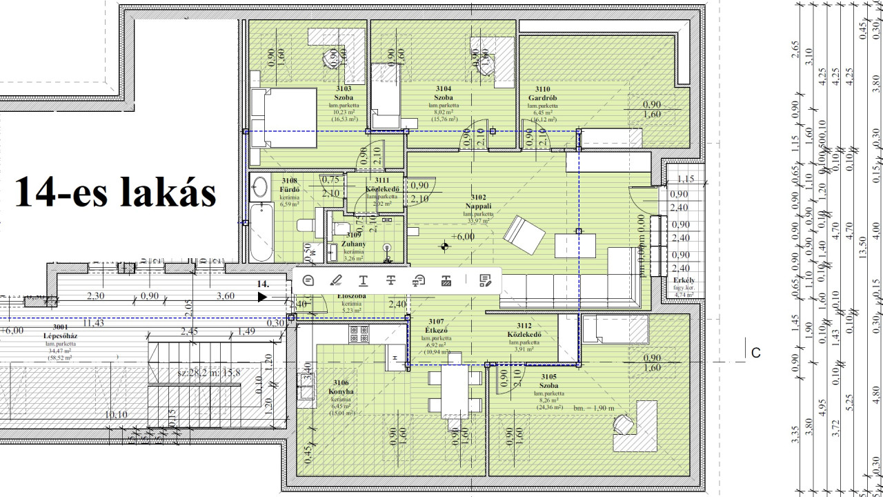 11-es lakás. 3 szoba + nappali, 107,65 m2 (+ 9,83 m2 erkély + 5 m2 tároló). 140,398 Millió Ft (+ felszíni parkoló 1,5 Millió + Tároló 2 Millió össz.: 143,898 Millió Ft)