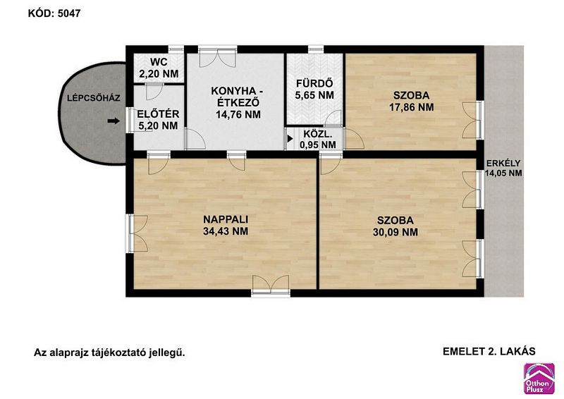 EMELET 2-es lakás (112m2 + 14m2 erkély), Ára: 89.9mFt + garázs: előtér (5.2m2), konyha - étkező (14.76m2), nappali (34.43m2), wc (2.2m2), közlekedő (0.95m2), 2 szoba (17.86m2., 30.09m2), fürdőszoba + wc (5.65m2), erkély (14.05m2). /Kód: 5049/