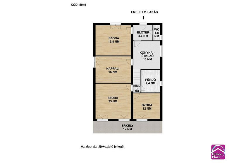EMELET 2-es lakás (100m2 + 12m2 erkély), Ára: 89.9mFt + garázs: előtér (4.6m2), konyha - étkező (13m2), nappali (16m2), wc (1.8m2), közlekedő (2m2), 3 szoba (12m2., 23m2, 19.8m2), fürdőszoba + wc (7.4m2), erkély (12m2). /Kód: 5049/