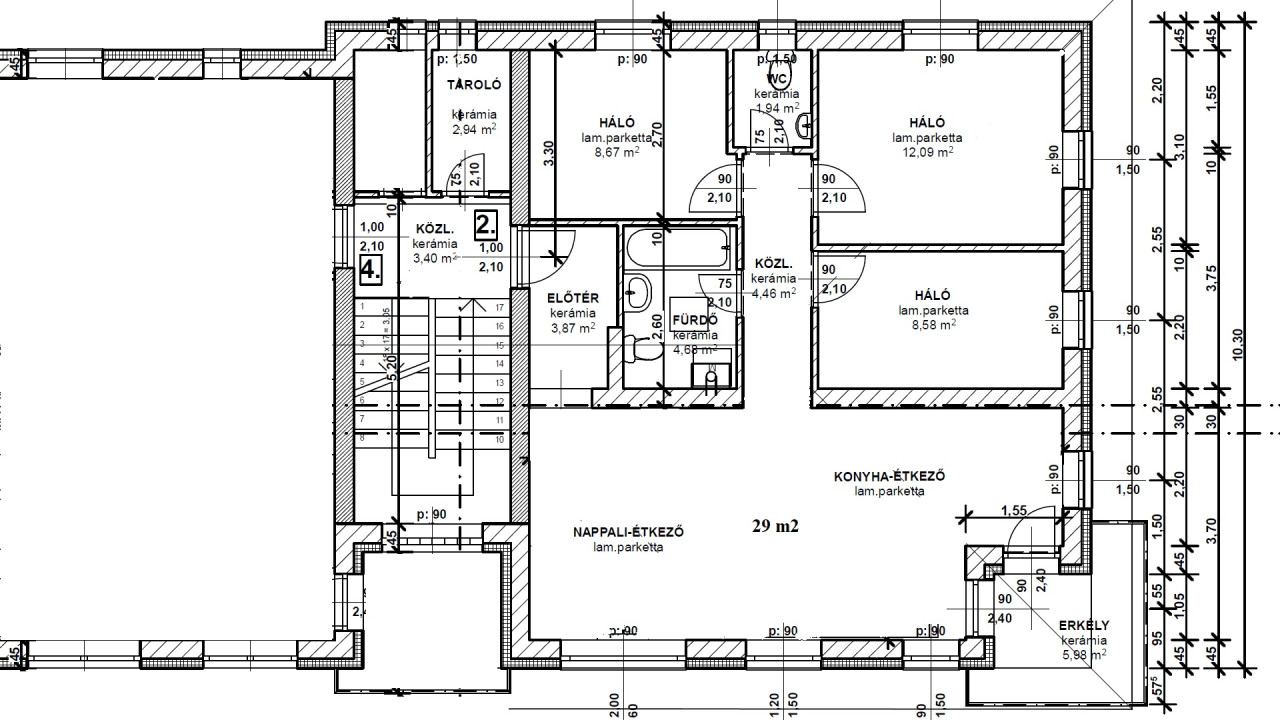 A szobák laminált parketta, nappali-konyha-étkező részen vízálló kivitelben, az előszobában és vizes helyiségekbe kerámia burkolat került.