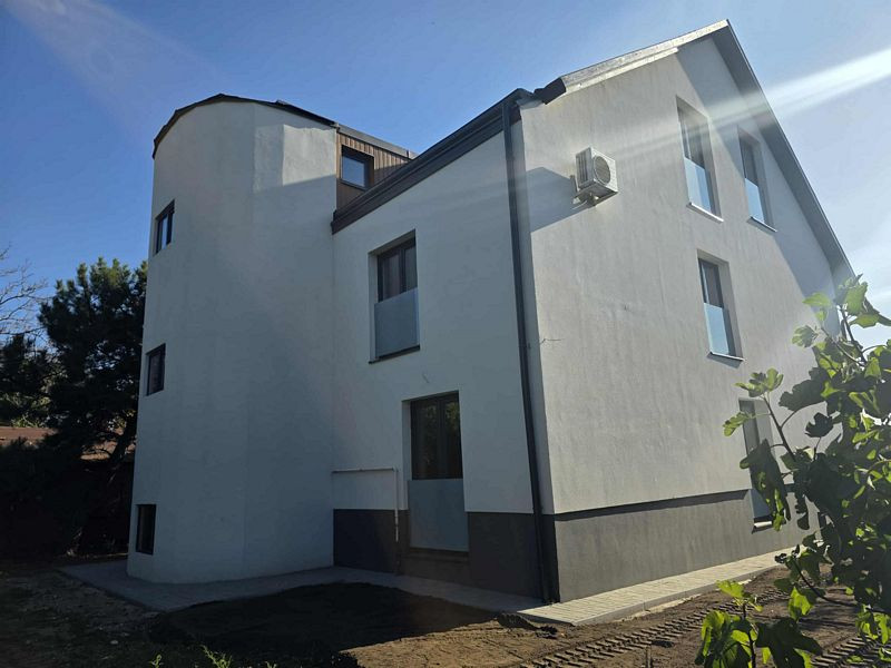 Szerkezeti leírás: Beton alap. Tégla főfalak + 15cm dryvit szigetelés. Tégla válaszfalak. A külső nyílászárók erős vasalatú, műanyag szerkezetűek, 3 rétegű fokozott hőszigetelésű üvegezéssel ellátva, antracit színben. A tetőtéri lakás tetősíkjainál Velux fa szerkezetű ablakok lettek beépítve. Bramac cserép fedésű tető, alatta fóliázva.