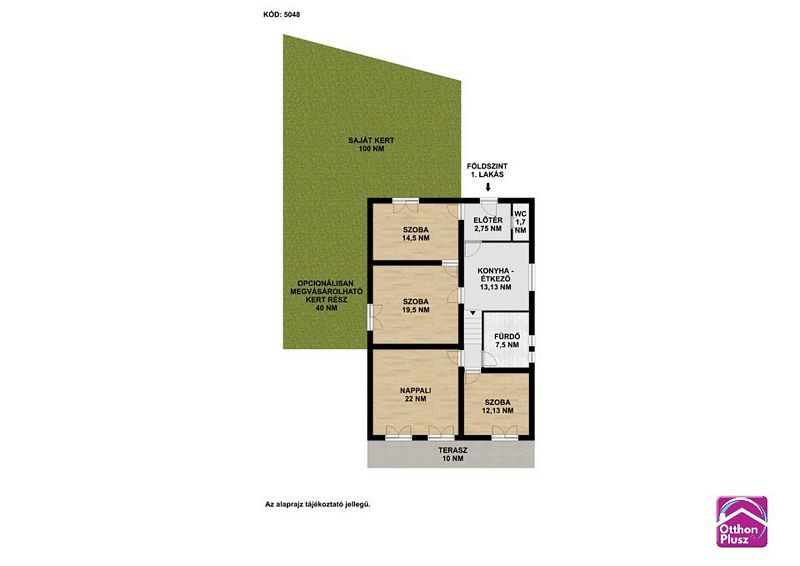 FÖLDSZINT 1-es lakás - SAJÁT KERTTEL (96m2 + 10m2 terasz + 100m2 saját kert), Ára: 94.9mFt + garázs: előtér (2.75m2), konyha - étkező (13.13m2), nappali (22m2), wc (1.7m2), fürdőszoba + wc (7.5m2), közlekedő (2.73m2), 3 szoba (12.13m2, 19.5m2, 14.5m2), terasz (10m2). /Kód: 5048/ Ennél a lakásnál lehetőség van nagyobb kertrészre + 40m2 kert + 3mFt.