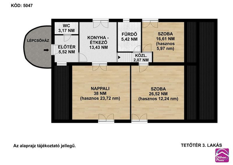 TETŐTÉR 3-as lakás (nettó 110.74m2, hasznos lakótér 72m2), Ára: 69.9mFt + garázs: előtér (5.52m2), wc (3.17m2), konyhs - étkező (13.43m2), fürdőszoba + wc (5.42m2), közlekedő (2.07m2), nappali (n°38m2/haszn. 23.72m2), szoba (n°16.61m2/haszn. 5.97m2), szoba (n°26.52m2/haszn.12.24m2). /Kód: 5050/