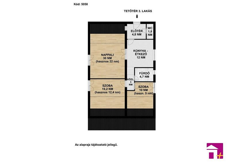 TETŐTÉR 3-as lakás (nettó 85.5m2, hasznos lakótér 65.7m2), Ára: 69.9mFt + garázs: előtér (4.8m2), wc (1.8m2), konyha - étkező (12m2), fürdőszoba + wc (4.7m2), közlekedő (3m2), nappali (n°30m2/haszn. 22m2), szoba (n°19.2m2/haszn. 12.4m2), szoba (n°10m2/haszn. 5m2). /Kód: 5050/