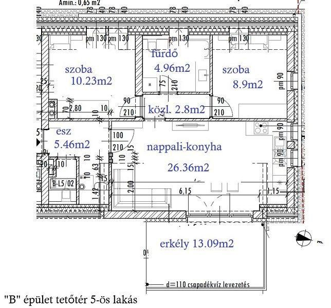 Tetőtér 5-ös lakás / nappali + 2 szoba (nettó 75m2 / haszn. 59.95m2 + erkély + parkoló + tároló), Ára: 79.9mFt + parkoló + tároló 2mFt: előszoba (5.46m2), nappali-konyha-étkező (26.36m2), wc (1.24m2), fürdőszoba (4.96m2), közlekedő (2.8m2), 2 szoba (8.9m2, 10.23m2), erkély (13.09m2). /Kód: 5172/