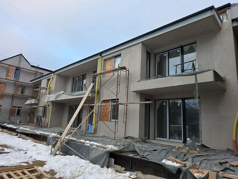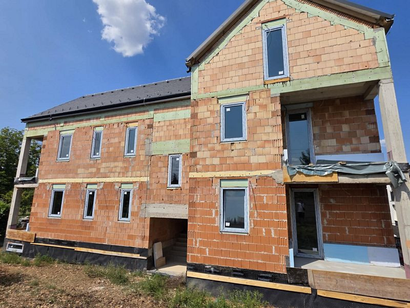 Szerkezeti leírás: Beton alap. Porothern tégla főfalak + 15cm dryvit szigetelés. Porotherm hanggátló blokktégla válaszfalak. A külső nyílászárók műanyag szerkezetűek, 3 rétegű fokozottan hőszigetelt üvegezéssel ellátva, kívül antracit, belül fehér színben, valamint rejtett redőnytok beépítéssel és elektromos redőny előkészítéssel (redőny és szúnyogháló nélkül). A belső nyílászárók dekorfóliás ajtók. Beton födém, 25cm kőzetgyapot szigeteléssel. Cserép fedésű tető.