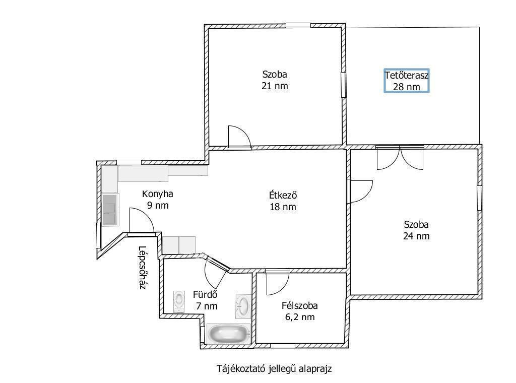 A lakás világos, jól átgondolt elrendezésű, 2,5 szobás + étkezős kialakítású, melyhez egy 28 nm-es, panorámás tetőterasz is tartozik, tökéletes helyszín reggeli kávézáshoz vagy esti pihenéshez.