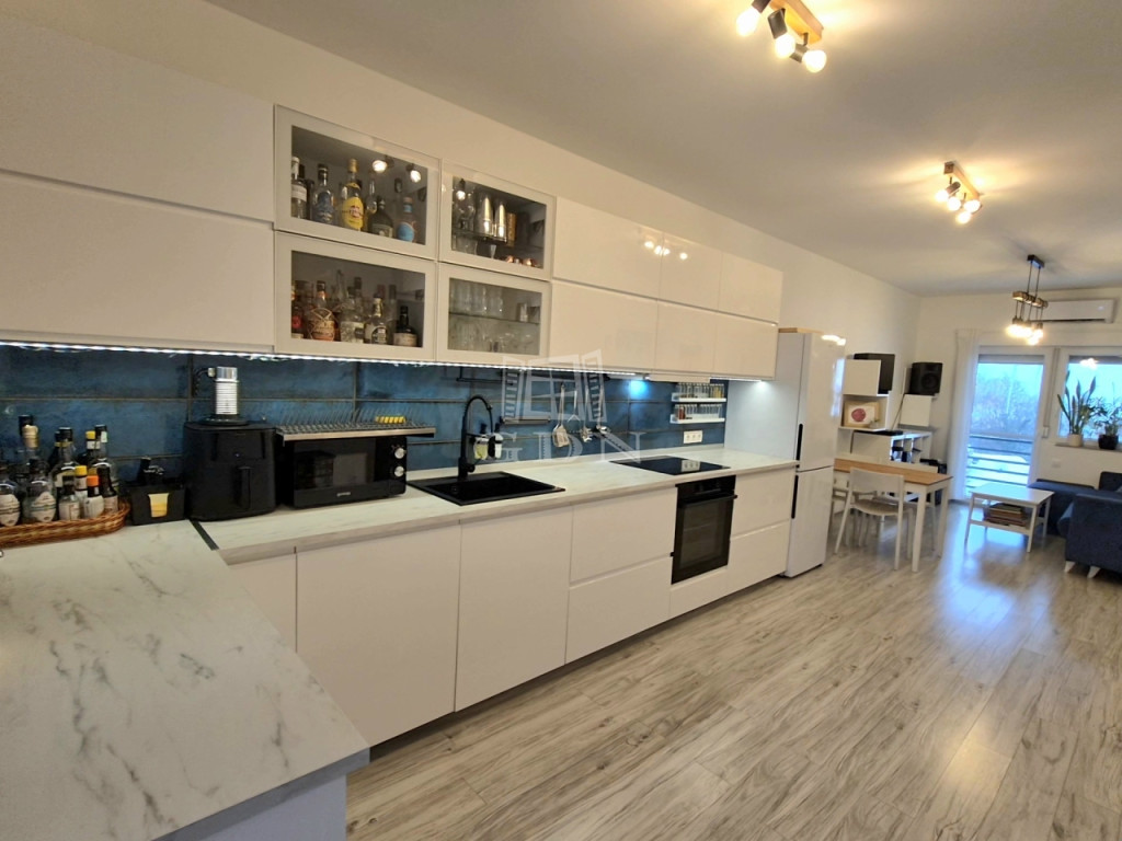 A lakás szíve egy hatalmas, világos, amerikai konyhás nappali, amely tökéletes helyszínt biztosíthat baráti összejövetelekhez vagy a napi kikapcsolódáshoz.