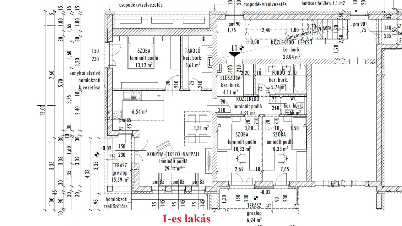 1-es lakás. 3 szoba + nappali, 84,5 m2 (+ 7 terasz), kertkapcsolat ~170 m2. 99,9 Millió Ft (+ kert 5 Millió + garázs 3 Millió vagy nyílt parkoló 2 Millió)