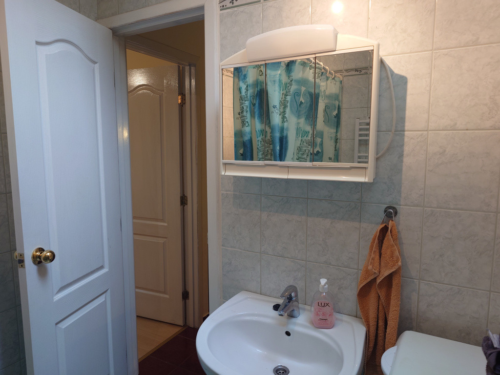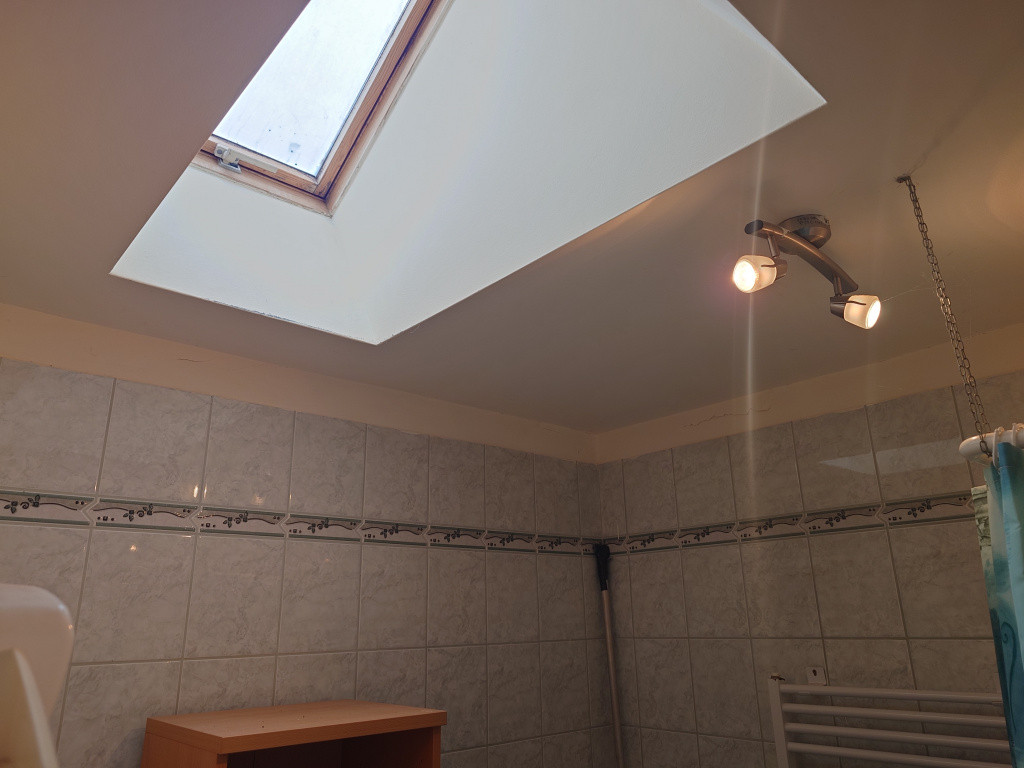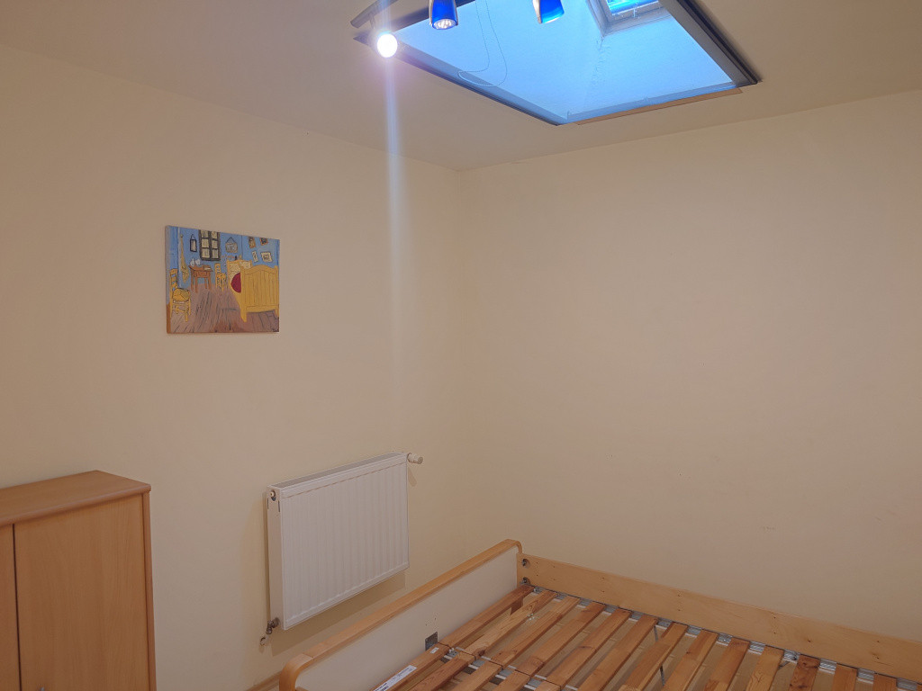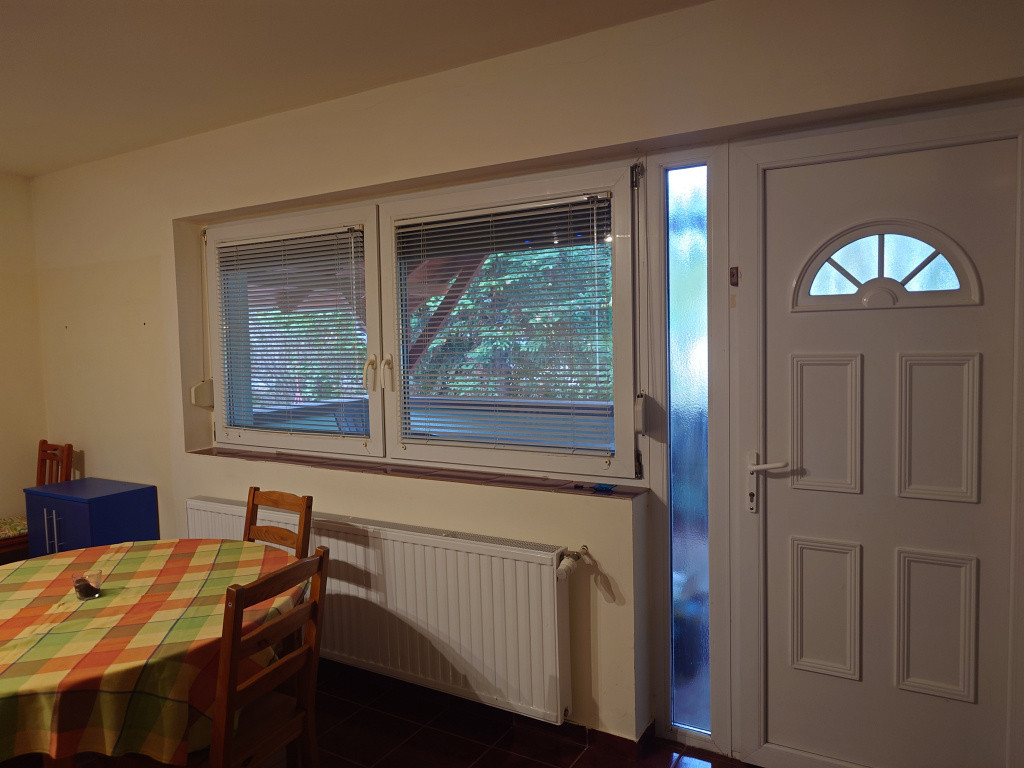 A szoba burkolata laminált padló, a fürdőszoba, konyha és közlekedő járólapos.