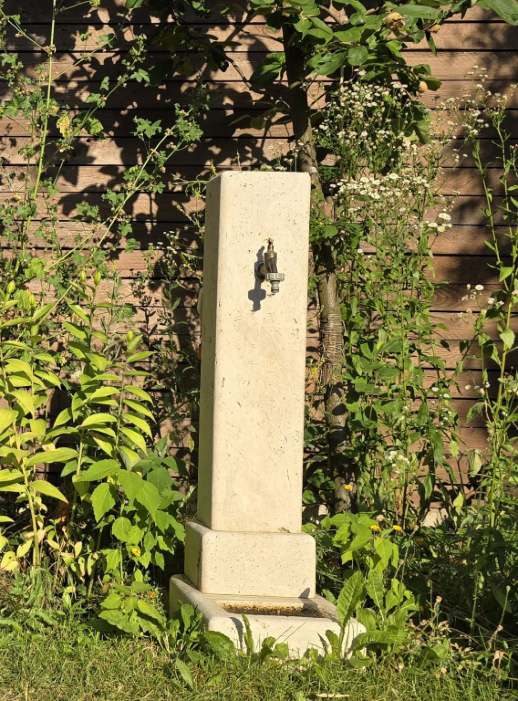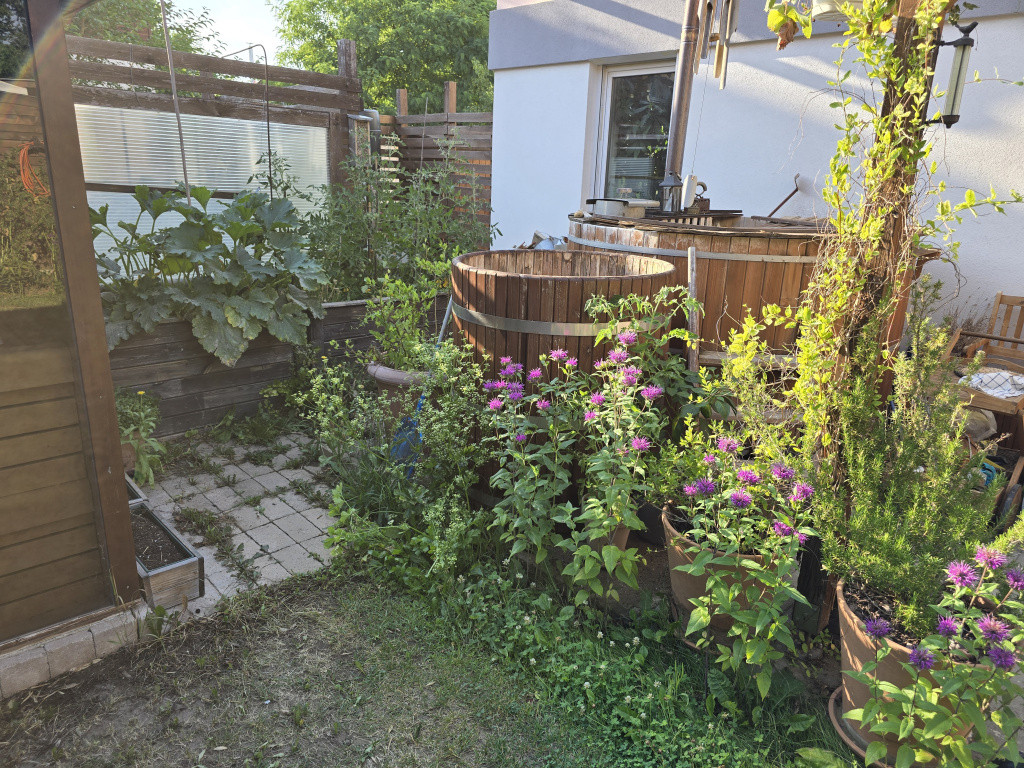 erdélyi fatüzelésű fürdődézsa + mészkőből faragott kerti kút + 6 méter magas fekete bambusz sövény a teljes intimitásért + magaságyások hobbikertészkedéshez