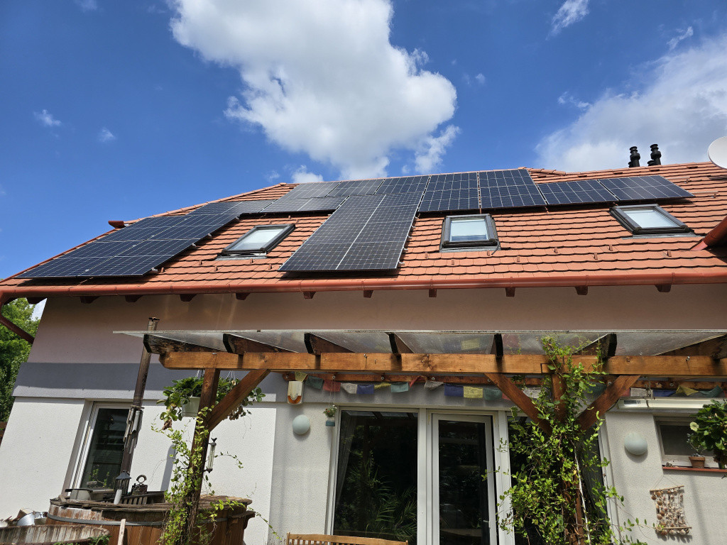 A tetőn elhelyezett 8,5 kWp teljesítményű napelemes rendszer a lakás teljes elektromos energiaigényét fedezi. Az éves kb. 5000 kWh többlettermelés lehetővé teszi akár két elektromos autó díjmentes töltését, vagy elektromos bojlerrel közel 0 rezsiköltségű működést.