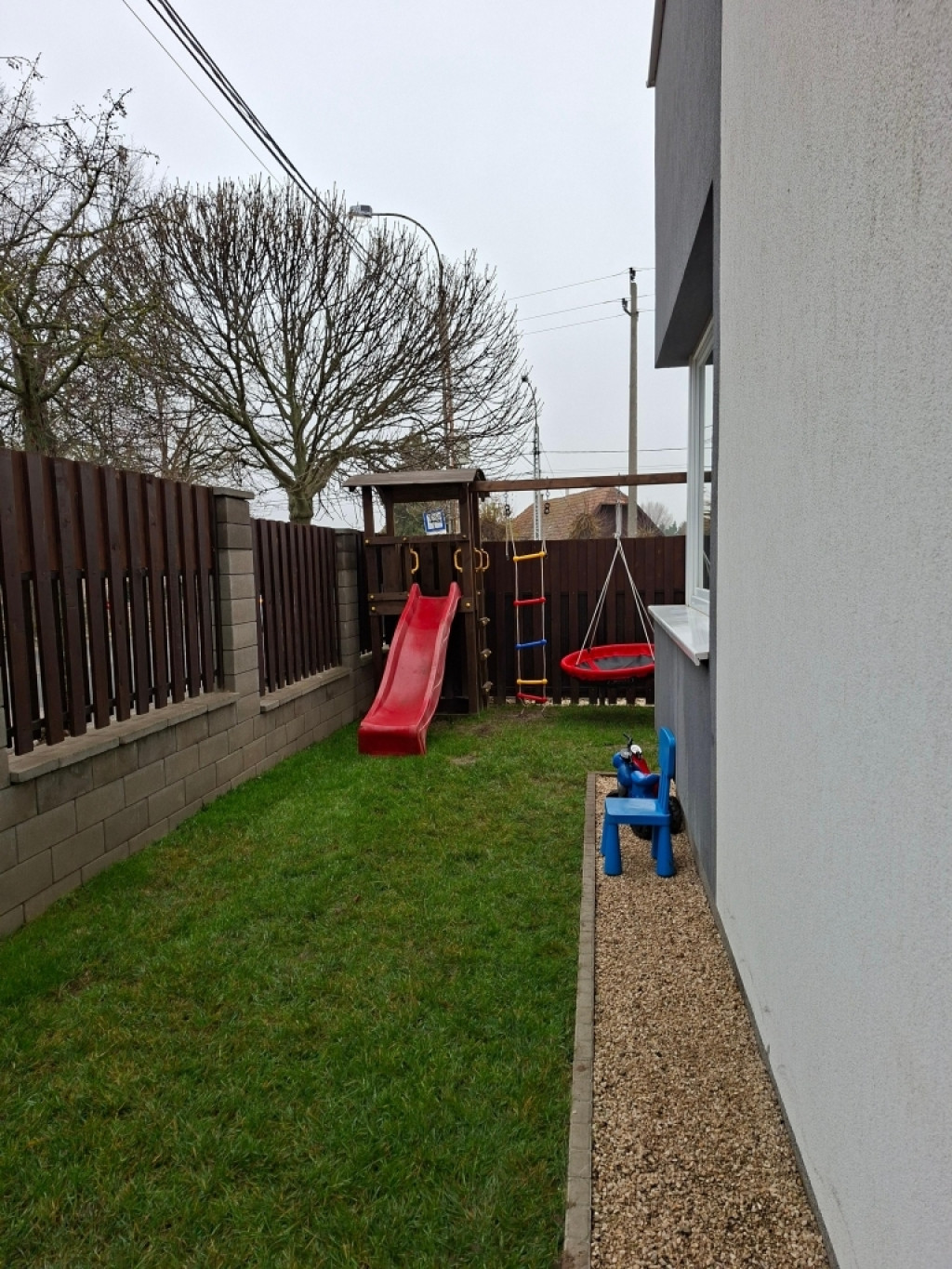 A kerben 50 m2 : modern, fából készült játszótér (mászóka, csúszda, hinta), kerti tároló a szerszámoknak, kényelmes teraszrész a grillezéshez, pihenéshez
