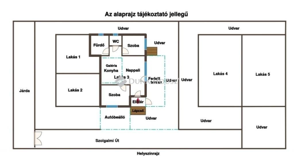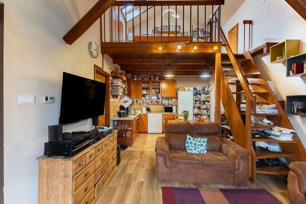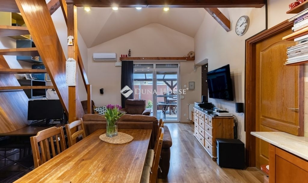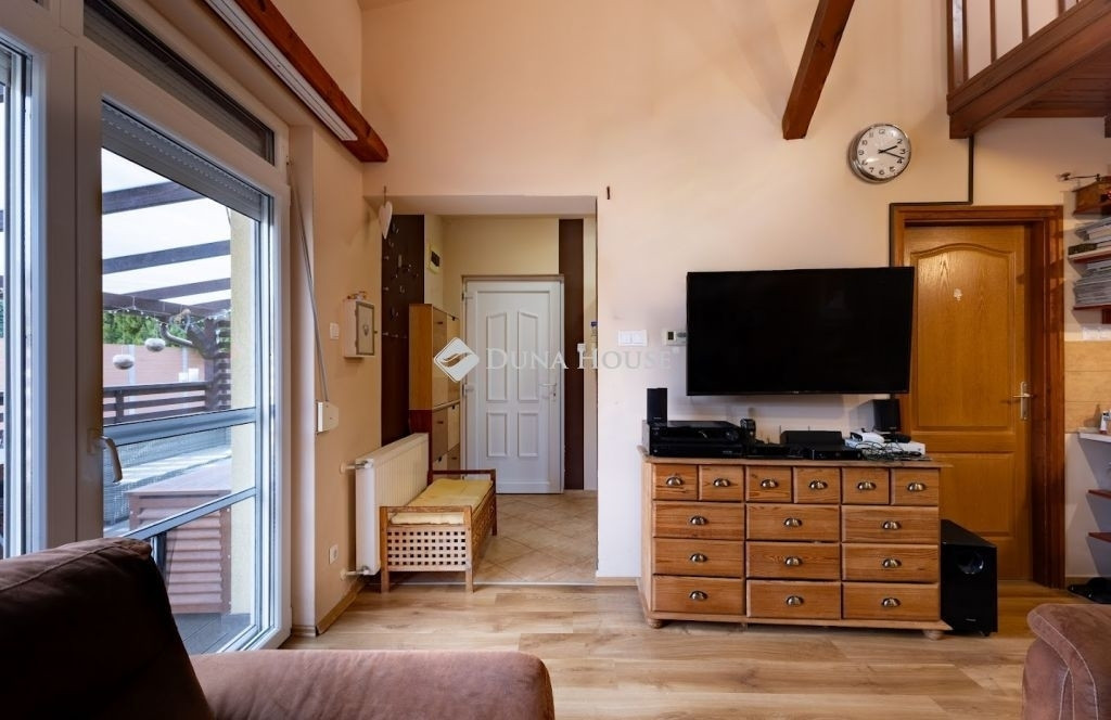 Az eladó lakás az utcától elektromos kapuval határolt, világítással ellátott szolgalmi úton haladva közelíthető meg. A 60 nm-es alapterületén kialakításra került a 25 nm-es amerikai konyhás nappali, a konyha fölött 12 nm-es álló galériával, egy 11,16 és egy 10 nm-es szoba, a 6,7 nm-es fürdőszoba, valamint egy külön-bejáratú 1,54 nm-es WC helyiség. A galéria két oldaláról egy-egy külön helyiség nyílik. Az egyik oldalon egy polcozott gardrób, a másikon pedig egy tárolásra kiválóan alkalmas padlástér kapott helyet. A nappali, a galéria és a szobák aljzata laminált padlóval fedett, az egyéb helyiségek kerámia lappal burkoltak. A nyílászárók hőszigetelő üvegezésű műanyag ablakok, redőnnyel és szúnyoghálóval szerelve.