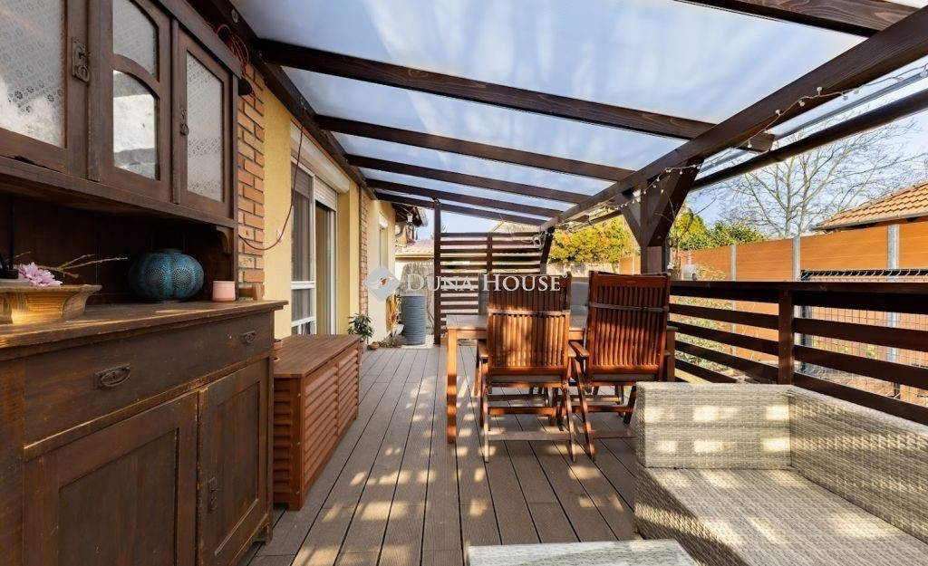 A nappaliból közvetlen kijárat vezet a 20 nm-es fedett teraszra, valamint a 68 nm-es kertbe, amely kívülről is megközelíthető.