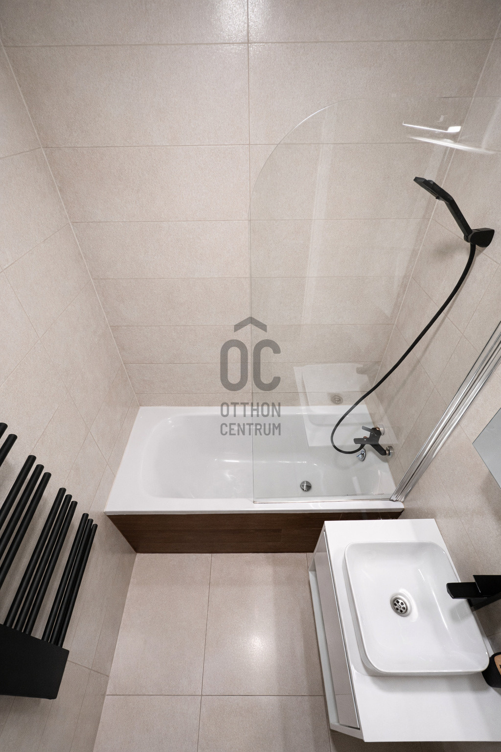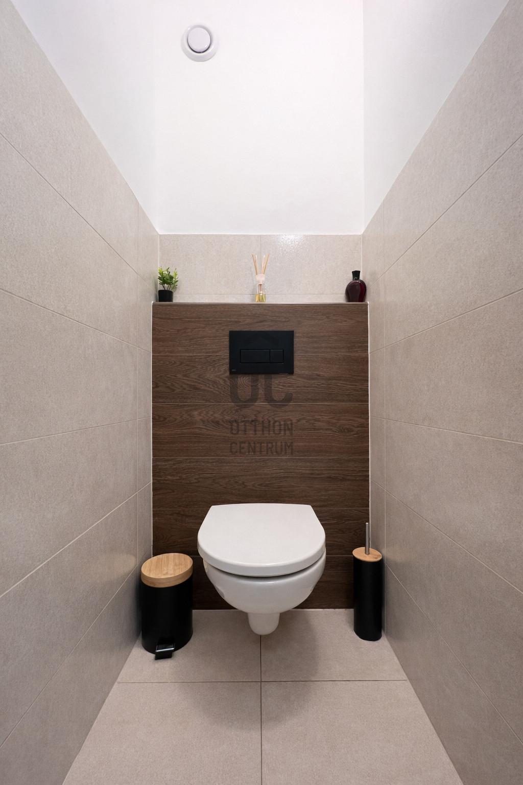 A praktikum itt valóban minden részletben megjelenik, hiszen a közlekedőben található nagyméretű beépített szekrény jelentős tárolókapacitást biztosít, melynek köszönhetően a mosógép és a szárítógép is elrejtve kapott helyet, így a fürdőszoba megőrizhette letisztult, rendezett hangulatát.