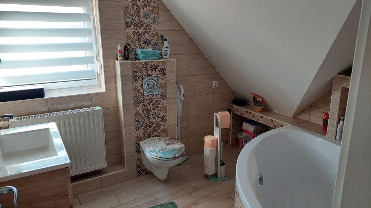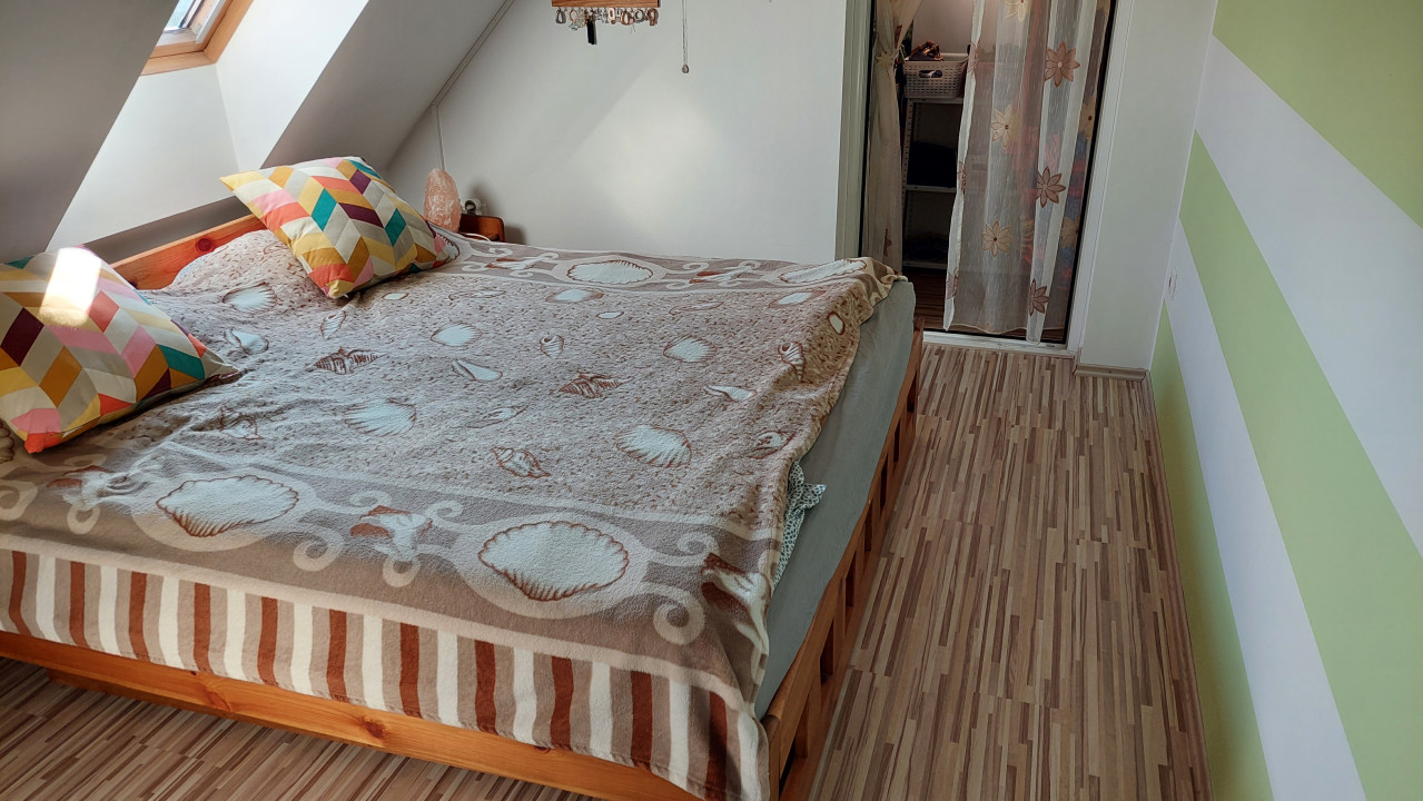A lakás belső két szintes elrendezésű, alul szélfogó, WC, konyha /beépített bútor + gépekkel/-étkező-nappali, és a lépcső alatt beépített tároló rész. Fennt 2 szoba, mindegyikhez gardrób bepolcozva, ill. fürdőszoba sarokkáddal és WC-vel.