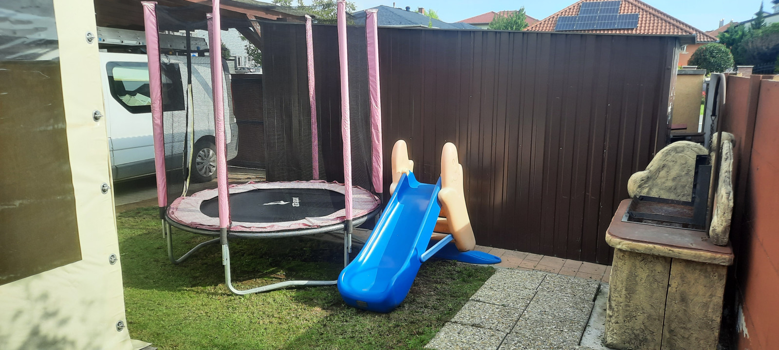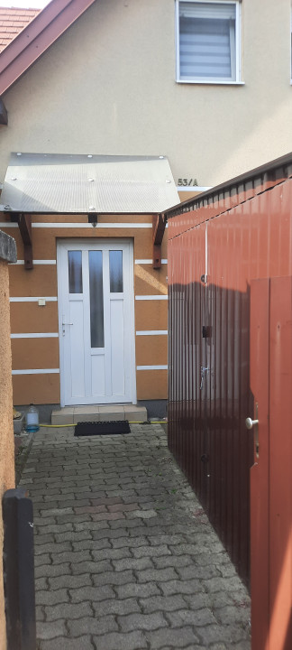 Kertkapcsolat /utcafrontról/ egy saját udvari, fedett gépkocsibeállóval. Az udvaron található 2db lemeztároló: 2*4m-es és egy 2*1,5m-es.