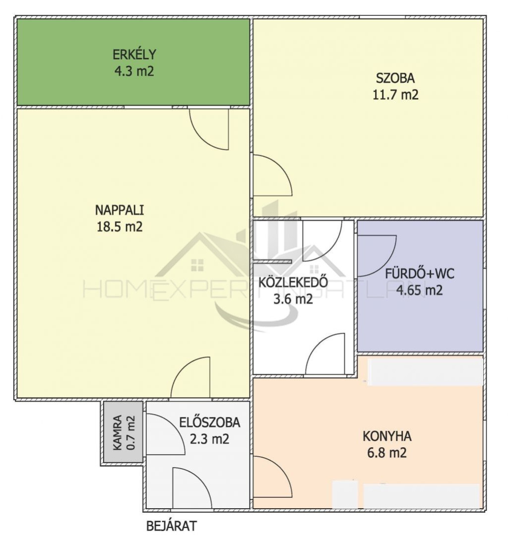 Az ingatlan elosztása: (lásd alaprajz): előszoba, 2 egész szoba, erkély, közlekedő, konyha, kamra, fürdőszoba, erkély. A saját tároló a pincében található.