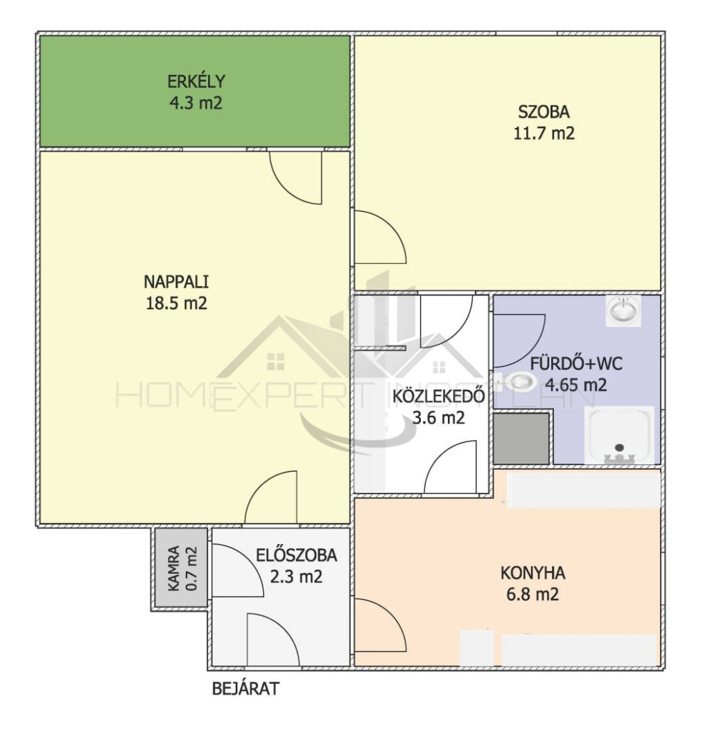 Az ingatlan elosztása: (lásd alaprajz): előszoba, 2 egész szoba, erkély, közlekedő, konyha, kamra, fürdőszoba, erkély. A saját tároló a pincében.