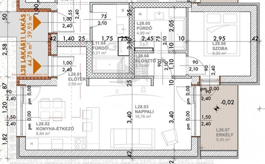 Az L28-as lakás, földszinti, 44,78 m2 alapterületű, amihez 5,45 m2-es terasz tartozik.
