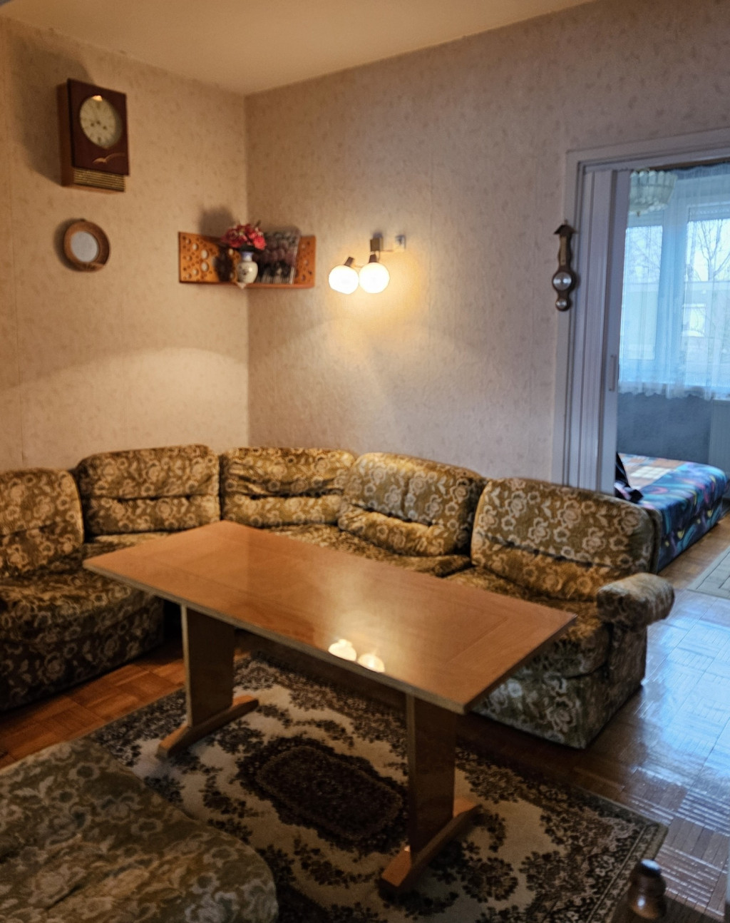 A lakás elosztása: előszoba, konyha, nappali + hall +2 szoba, külön helységben a fürdőszoba és a WC + erkély.