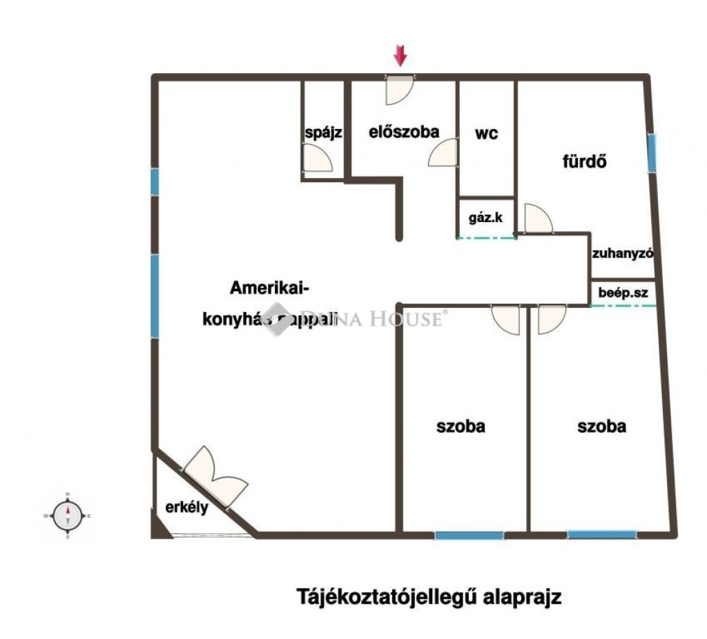 - Amerikai-konyhás nappali, - 2 szoba, - fürdőszoba, -WC, - előszoba, - közlekedő, - kamra