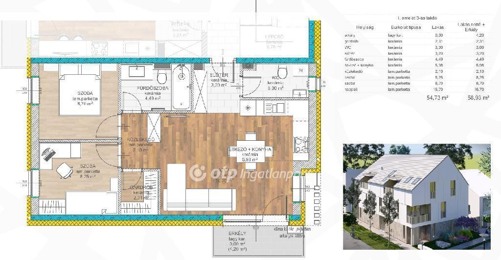 Jelen hirdetési ár az 1. emelet 3-as lakás, amely 55m2 + 4,2 erkély.