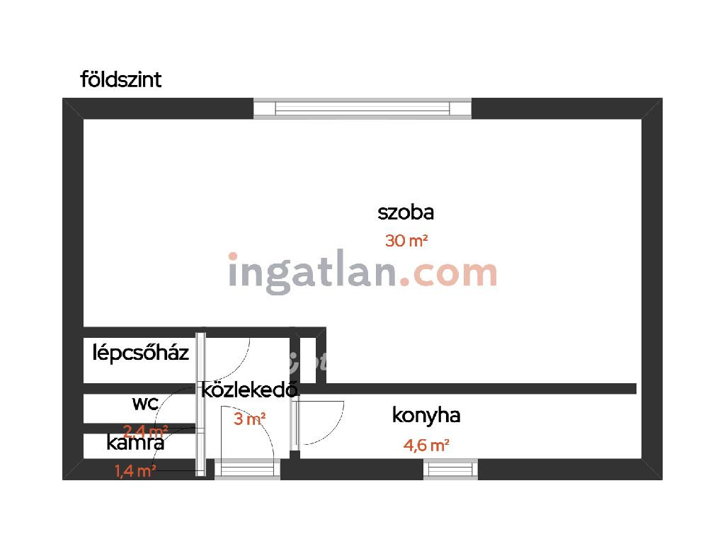Földszint: nappali +konyha, WC kézmosóval, előszoba, lépcsőfeljáró, tároló, terasz.
