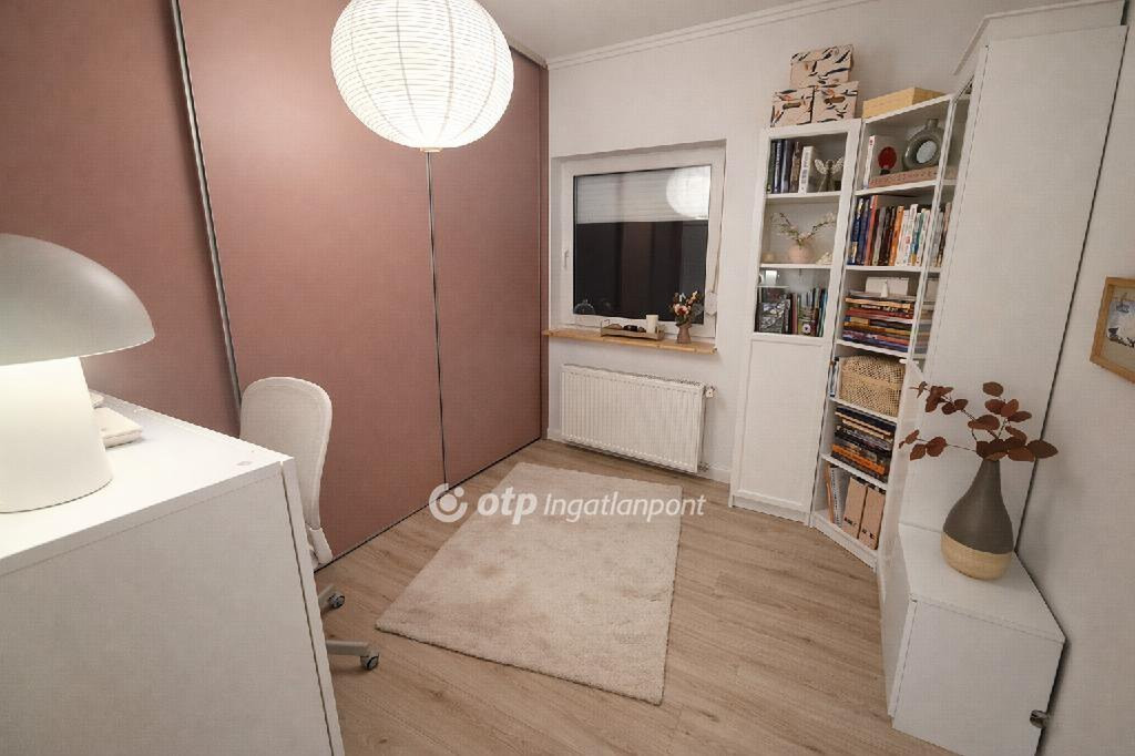 A lakás elrendezése ideális: két külön nyíló szoba mellett egy amerikai konyhás nappali biztosít tágas, élhető teret. Az ingatlanhoz tartozik egy teremgarázs-hely, továbbá egy körülbelül 180 nm-es, kerítéssel határolt, kizárólagos használatú kert is. A kert elhelyezkedése miatt kifejezetten intim, az utcától elszeparált, így kiváló pihenéshez vagy akár kiskerti növénytermesztéshez. Itt egy kb. 10 nm-es tároló is helyet kapott, valamint kialakított veteményes rész is rendelkezésre áll.