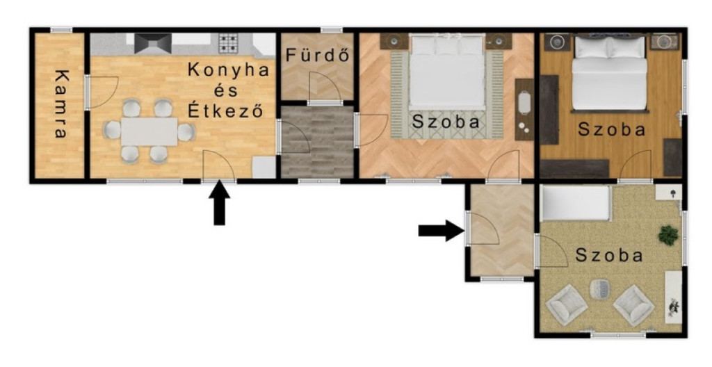 3 szoba, étkezős tágas konyha, nagy kamra, fürdőszoba, előszoba, közlekedő
