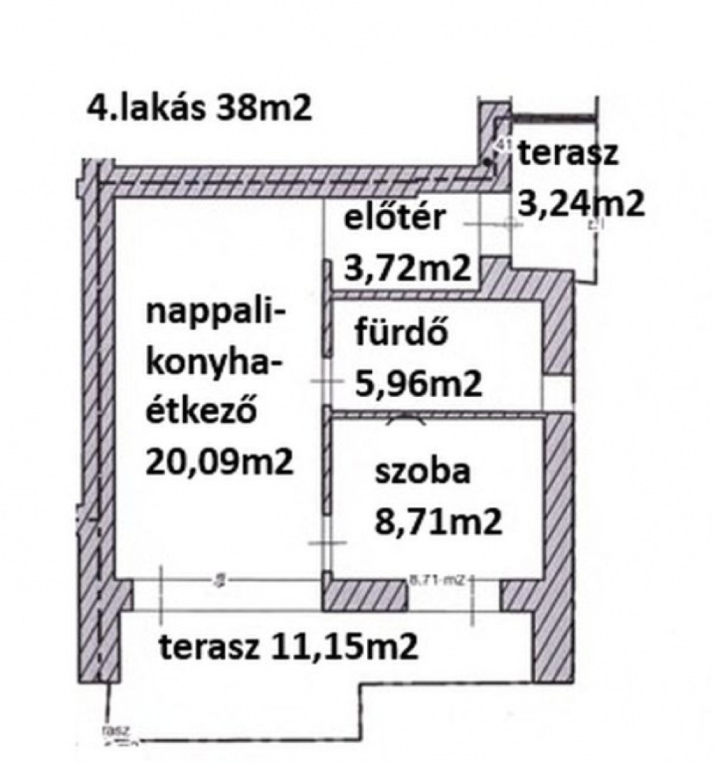 • Lakás alapterülete 38m2, kert 88m2, terasz 14m2