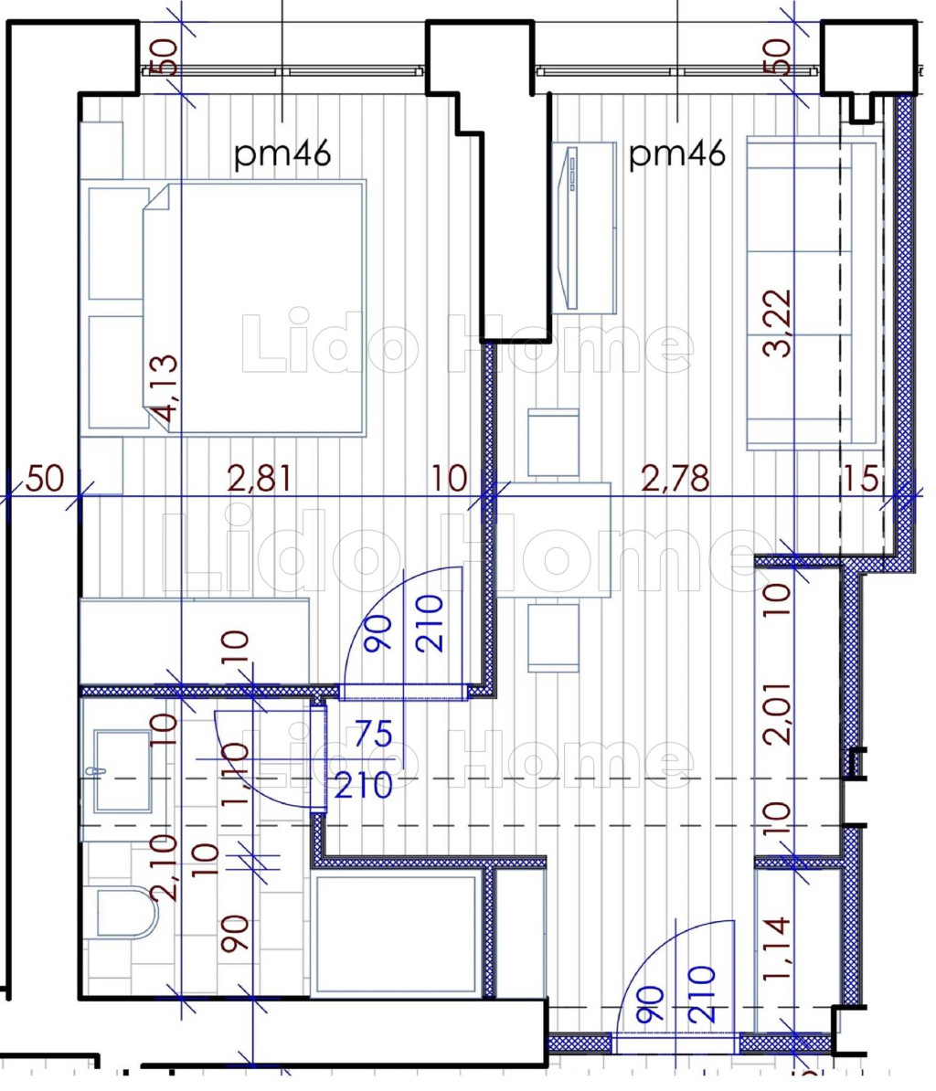 33,4 m2 területű lakás helyiségei: amerikai konyhás nappali, hálószoba, fürdőszoba WC-vel, közlekedő.