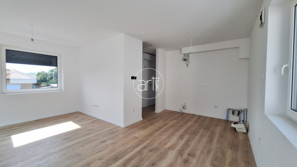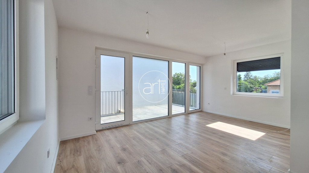 ELRENDEZÉS: A lakás központja az amerikai konyhás nappali, amelyből közvetlen kijárat nyílik a teraszra. A fél szoba ideális dolgozónak, gardróbnak, hálófülkének vagy kisebb gyerekszobának.