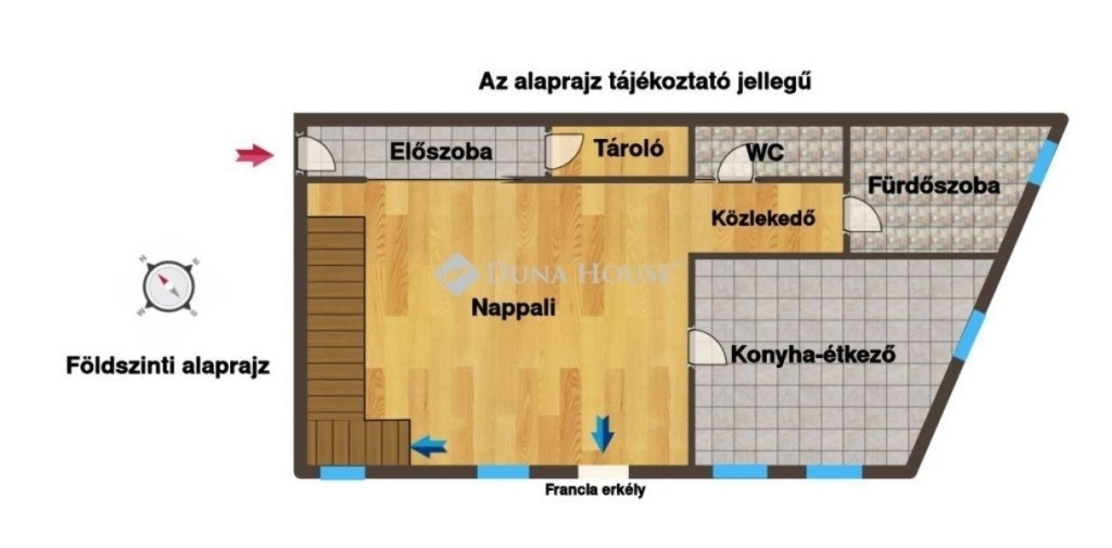 A délnyugati tájolásnak köszönhetően a lakás egész nap világos, barátságos hangulatú. A földszinten egy tágas nappali, étkező-konyha, fürdőszoba, külön WC és tároló kapott helyet, így a közösségi terek ideálisak a mindennapi élethez és a családi együttlétekhez.