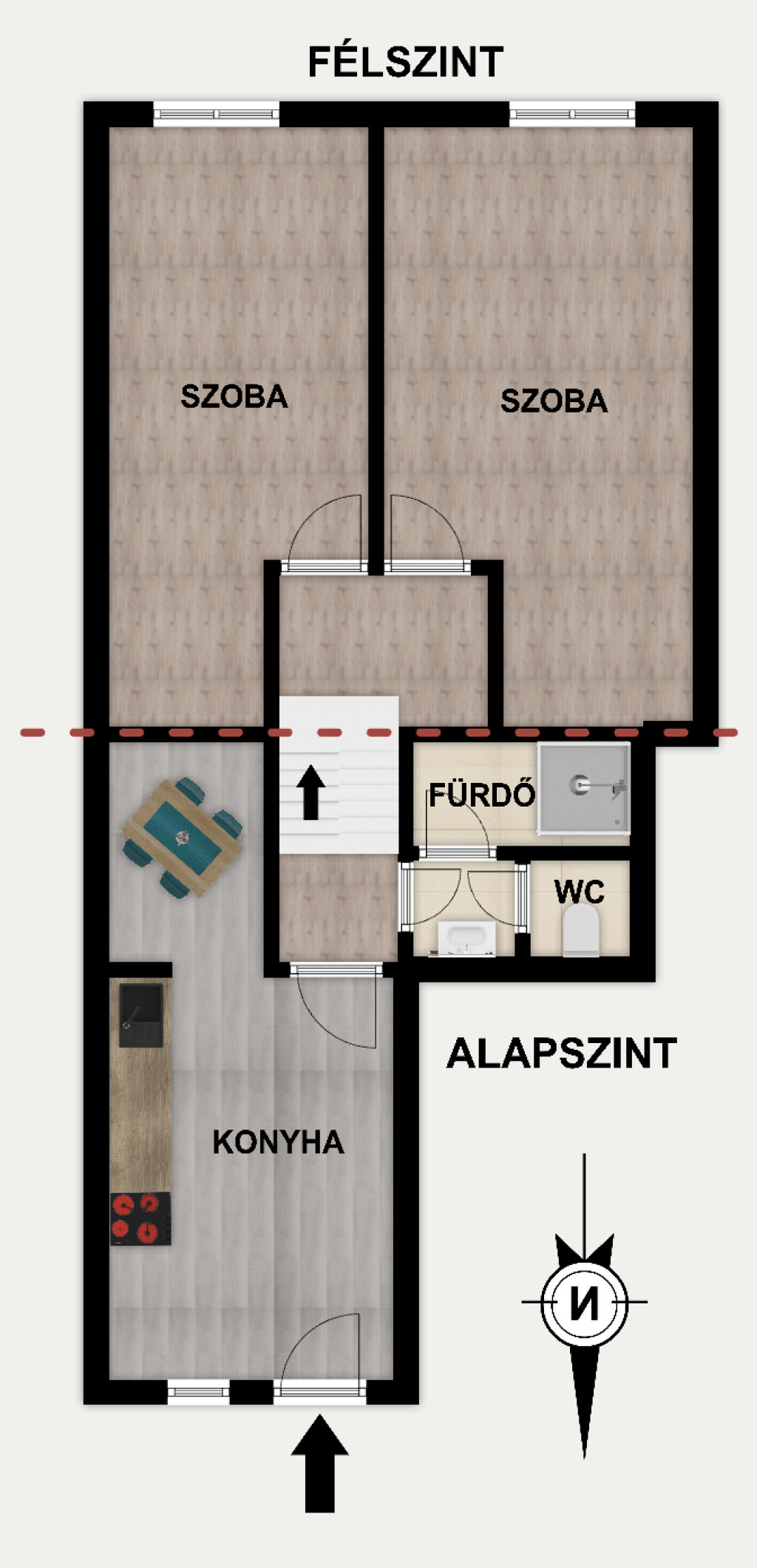 Az alap szinten konyha étkező, fürdő és mosdó található.